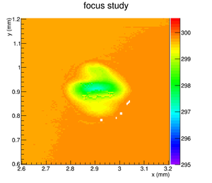 Each pixel in the plots shown in Figures 7 represents one laser pulse, with the color representing the pulse height integral. The lower-most row should be ignored because the scanning program was not yet fully synchronized to the raster pattern. The widths of the focal spot in x and y are shown in the RMS values of the fits in Figure 8. The values in x and y are roughly the same, 65 µm vs 48 µm respectively. Figure 7a shows a maximum intensity at a z position of 4.8mm, however it is interesting to note that the shape of the focal spot does not appear to change drastically away from this point. The optical setup has a narrow focal spot with a wide depth of field which is ideal for the purpose of laser ablation. From this study it was also concluded that the use of a collimator at the focal point of L1 and L2 greatly reduced the background seen by the harp scan and should be used during the ablation process to protect the diamond surface away from the ablation point