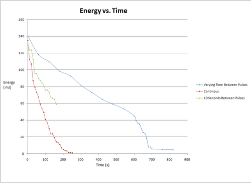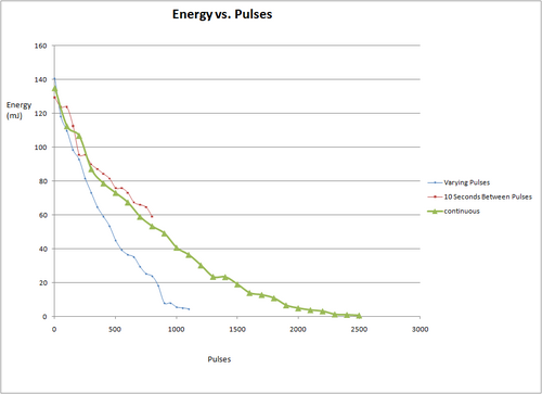 - It was thought that the gas was being contaminated by the act of recirculation within the laser cavity via the gas processor. To test this, the beam energy was first monitored every ten seconds with a standard fill (150mbar , 350mbar Ar, 1700mbar He) and ran at 10Hz/26kV. After a new fill, the high voltage was increased from zero to 26kV (and held for 5 seconds) on every ten second mark and then on every one minute mark. If the circulation of the gas is to blame for the decrease in energy, then I expected to see the energy to drop as the original continuously running at 26kV) trial. This is what I saw after the three runs,