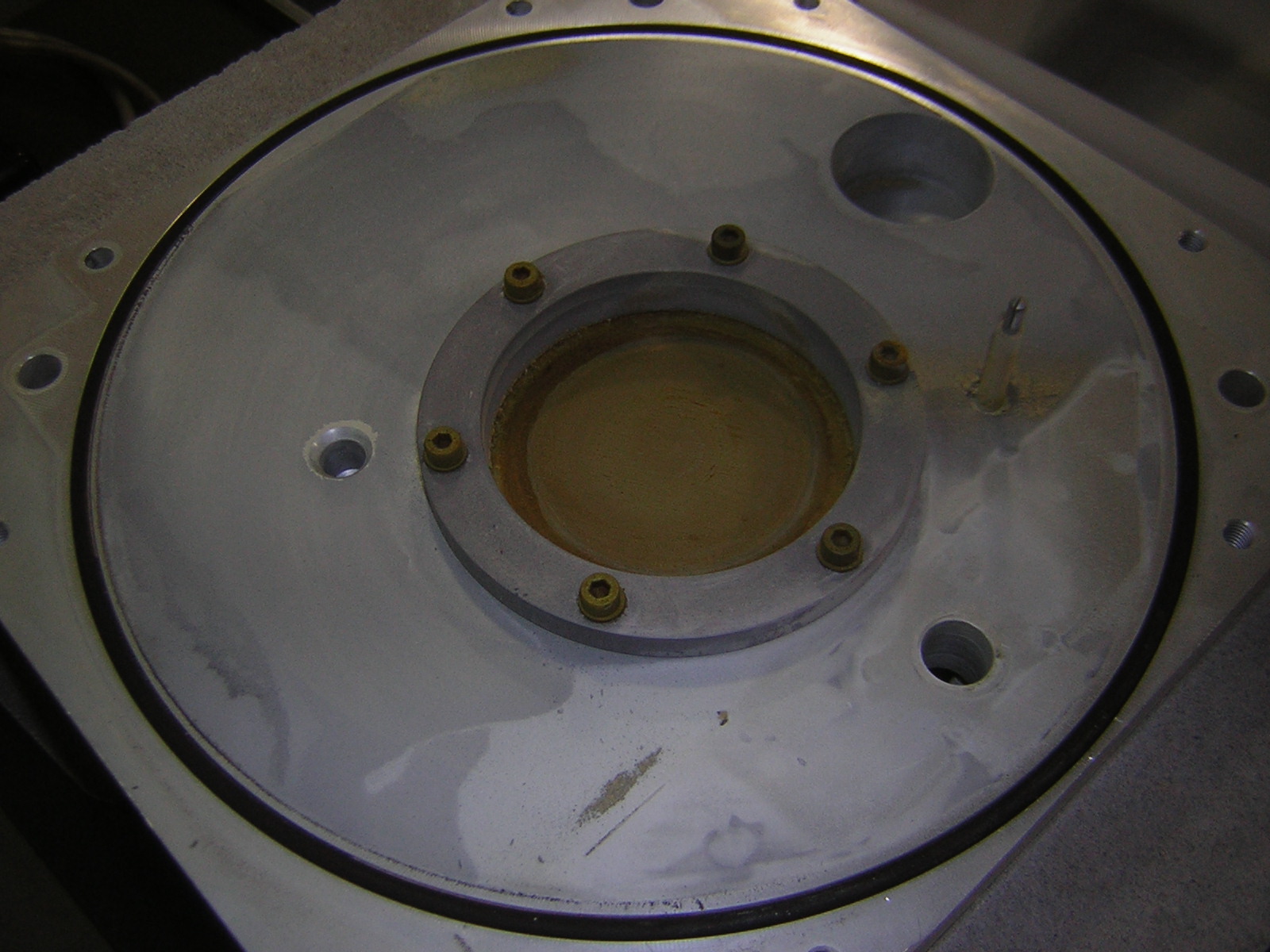 Front end cap removed from gas cavity before cleaning. Notice the magnetic bearing that connects the drive from the exterior motor to the interior circulating fan.