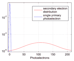 Distributions of primary and secondary photoelectron signals (noise included) for one incident primary photoelectron.