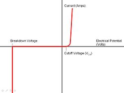 As with any electrical device, when the electrical potential is 0, there is no current flowing. Even at very small electrical potentials in the forward direction, no current flows in a diode. A diode only begins to act like a conductor once it reaches a cutoff voltage(). Upon reaching that cutoff voltage, the semiconductor begins to act like a conductor, causing the amount of current to increase very quickly. When an electrical potential is placed across a diode in the reverse direction, the diode prevents all current from flowing until a certain breakdown voltage. At that breakdown voltage, the diode is no longer able to hold back the electrical potential and spontaneously breaks down, becoming a conductor, no longer resisting current flow. This results in a sharp spike of current in the reverse direction. The breakdown voltage is much larger than the cutoff voltage.